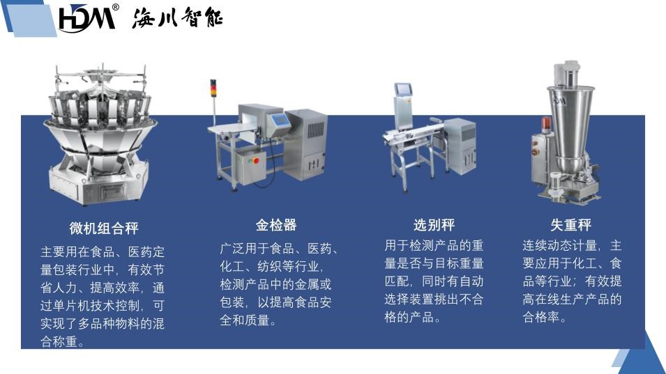 不止于硬件:我们提供覆盖生产全链路的智控系统 在包装生产中,每一环节的精准计量都关乎最终产品的安全、合规与成本控制。海川智能以高精度称重与智能检测设备为核心,助力企业实现生产数据的高效管理与设备的智能化监控,为产品质量保驾护航。 · 智能计量组合解决方案: 以微机组合秤为核心,融合先进传感技术与智能算法,通过动态称重与闭环控制,实现高精度稳定称重,支持自动校准、远程监控及生产数据记录,适配休闲食品、海鲜水产、蔬果农产品等食品行业的物料特性; · 一体化安全质控方案: 金属称重一体机,集金属异物探测与在线重量检测于一体,同步完成高灵敏度金属异物检测与高精度重量分选,安全地从生产线上剔除受污染的产品,保障安全与合规。从源头杜绝金属污染与重量不达标产品流出是金属异物探测和在线称重的最佳解决方案。 · 连续生产精准配料方案: 失重式喂料系统专为连续化生产设计,在不停机的前提下实现±0.5%以内的配料精度。不仅保障了配比一致性,更为工艺稳定性与产品一致性提供可靠支持,尤其适用于对配比敏感的高标准生产场景。 合作不止于设备:海川智能提供全流程计量与质控解决方案 我们与客户的合作,始于称重,却远不止于称重。海川提供的是涵盖诊断咨询、方案设计、系统集成、运维支持与数据服务的全周期赋能: 系统化流程设计: 我们提供从物料投入、实时称重到精准计量再到质量检测的全自动化流程设计与协同方案,帮助您实现整线运行效率的提升与人力依赖的降低。 智能工艺优化支持: 基于实时生产数据的分析反馈,我们能够通过系统实现工艺参数的动态调优与质量闭环管控,帮助生产持续趋于稳定与高效。 在 10.1F13展台,您将能了解到: · 面对面交流:与我们的技术团队深入探讨从单点计量到系统质控的升级路径; · 产线诊断服务:获取针对您现有生产流程的定制化优化建议与方案; · 技术新探:进一步洞察市场趋势,一同探索了解称重计量领域的前沿技术与创新应用,助力客户实现业务升级求。